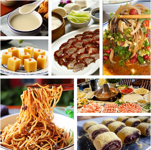 特色美食:北京烤鸭、铜锅涮肉、卤煮火烧、门钉肉饼、炸酱面、京酱肉丝、炒肝、豆汁、豌豆黄、爆肚、驴打滚……