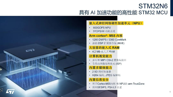 一条路径以高性能通用MCU为核心。意法半导体推出的STM32N6系列微控制器是其首款搭载自研Neural-ART加速器(神经网络处理单元,NPU)的高性能MCU。其NPU算力高达600 GOPS,并拥有优异的能效比(3 TOPS/W),同时集成了迄今STM32 MCU中最大的4.2MB SRAM。这些特性使其能够高效地在设备端本地运行AI模型,进行实时数据处理。