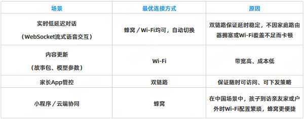 混合通信的核心价值,正在于它能同时兼顾广域覆盖、用户体验与成本效益。在覆盖层面,蜂窝网络确保了玩具在户外、车上、酒店等无Wi-Fi环境下的“永远在线”;而在中国,蜂窝物联网基础设施的大规模部署(预计2027年移动物联网终端连接数将突破36亿)为此提供了坚实底座。在家庭环境中,Wi-Fi则承担高带宽任务,如大模型推理请求、固件升级、内容下载等。这种分工使得AI玩具不再局限于“家里的玩具”,而真正成为“陪伴孩子的智能伙伴”,无论身处何地都能保持连接与智能。