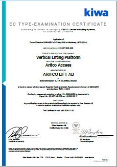 在欧洲,所有涉及人员升降的电梯设备,必须符合欧盟机械指令 2006/42/EC,并通过独立公告机构的严格审核。Aritco多款核心产品均获得 EC Type-Examination(CE 型式检验)证书,覆盖不同使用场景与产品系列。