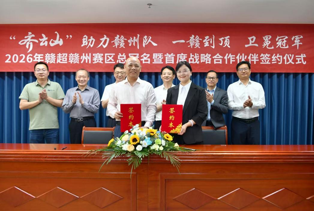 4月13日,2026赣超赣州赛区总冠名暨首席战略合作伙伴签约仪式圆满举行。江西齐云山食品股份有限公司以300万元正式成为赛事总冠名方,为赣州城市足球队2026赛季卫冕征程注入强劲本土力量。