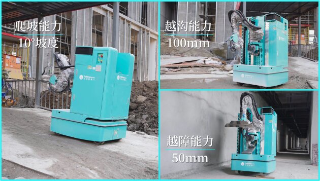 面向建筑工程施工场景的沟、坎、坡、积水、粉尘等复杂工况,产品采用自研四驱全向舵轮设计,越障高度50mm、爬坡能力10°、越沟宽度100mm,防护等级达IP54,可在高粉尘、高污染环境下长时间稳定运行。料箱升级至70L超大容量,按人工上料最舒适高度设计;自动回流清洗功能,让收工清洗时间大幅降低。