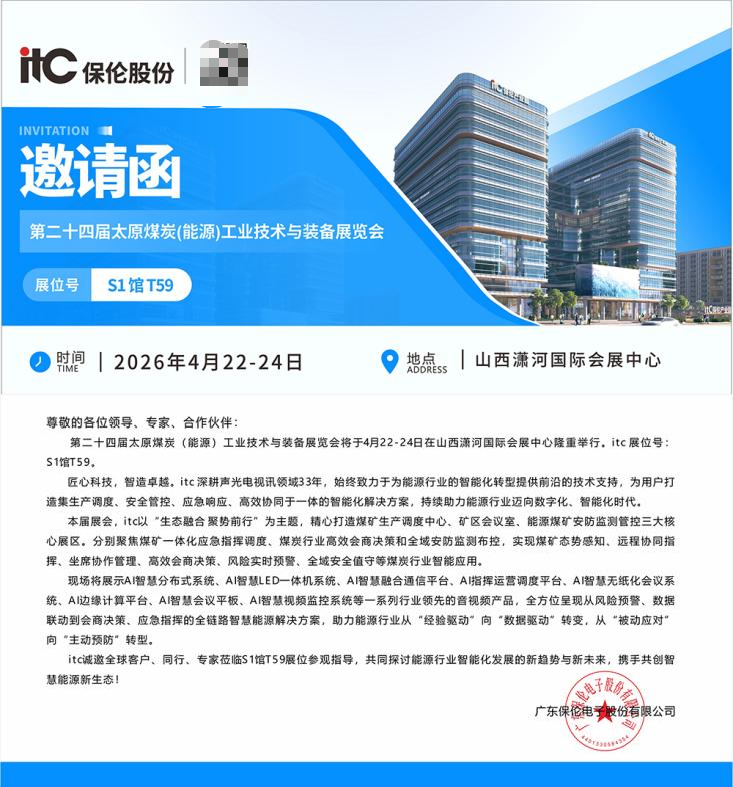 4月22-24日,itc保伦股份邀您共赴第二十四届太原煤炭(能源)工业技术与装备展览会!