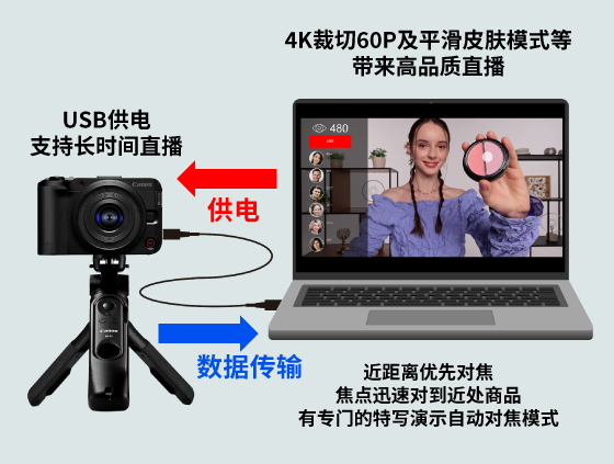 对于直播博主而言,相机的直播适配性与稳定性至关重要。佳能R50V机身新增LIVE直播按钮,一键即可进入直播菜单,设置4K 60P或平滑皮肤短片模式下的高画质直播。相机支持 UVC/UAC协议,使用USB线与电脑连接即可实现音视频传输与供电,无需额外采集卡,降低了直播搭建的成本与复杂度。