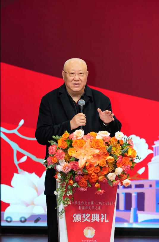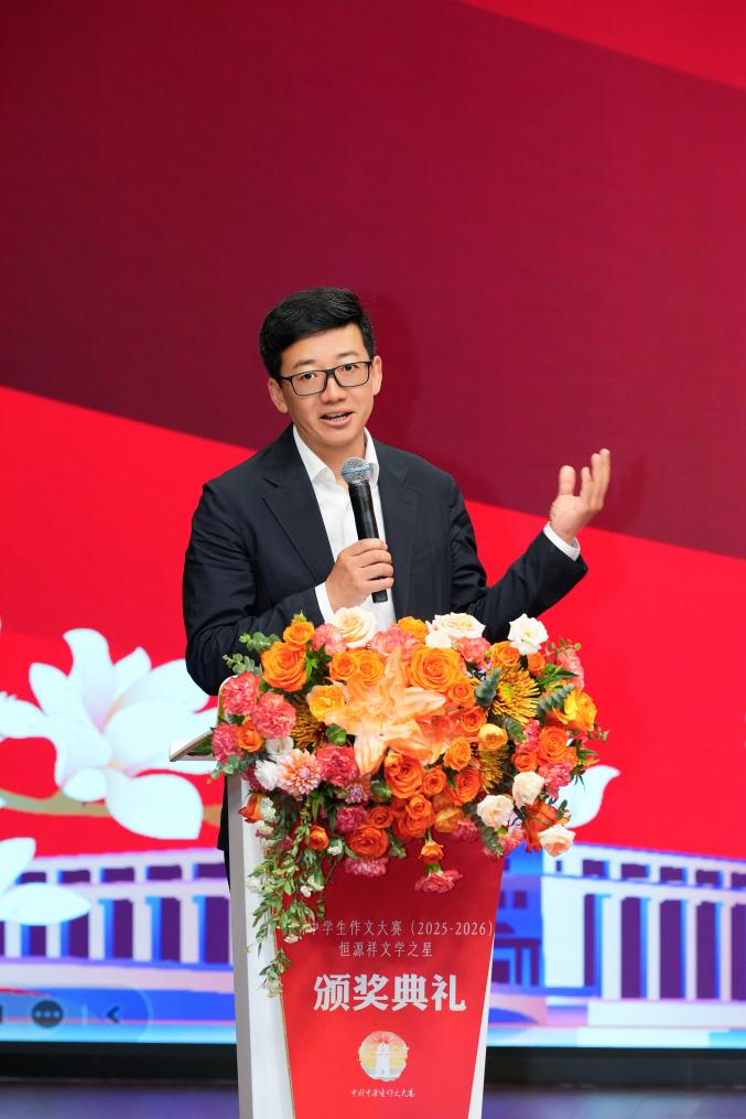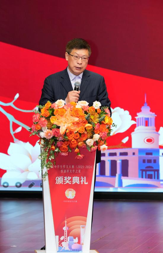 恒源祥(集团)有限公司董事长兼总经理、全国劳动模范、上海炎黄文化研究会副会长陈忠伟在讲话中表示:“文学不只是写一篇作文,更是在书写人生。”他提到于漪先生“育人而非育分”的教育理念,并指出:“个人成长与人格塑造密不可分,信念、理想与对人的尊重,是成就事业的根基。”他提到,恒源祥明年将迎来百年华诞,期待中国中学生作文大赛“恒源祥文学之星”评选活动也能走向百年。“今天的参赛者中,已有东南亚学子的身影。未来,我们希望这一平台成为全球青少年交流中华文化的重要桥梁。”他呼吁为青少年营造更宽松的成长环境,提供更广阔的展示舞台,让文学少年真正成为中华优秀文化的传播使者。