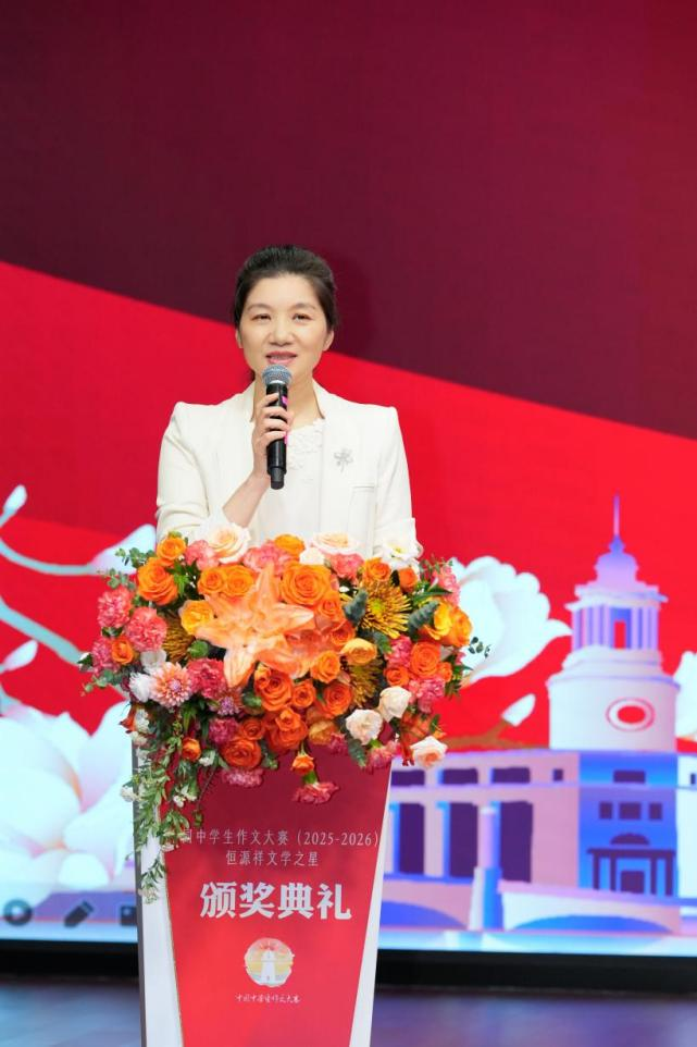 中国中学生作文大赛组委会常务副主任兼秘书长吕江虹在致辞中表示,本届大赛以“印记”为主题,同学们以笔为媒、以文抒怀,尽显对生活的热爱、对世界的思考、对未来的憧憬。她特别指出:“我们正步入AI时代,科技深刻改变阅读与写作形态。要守护传统写作的人文初心,也要拥抱变革,让深度阅读与走心写作成为对抗碎片化表达、沉淀内心力量的终身习惯。”她同时向恒源祥集团及承办单位致以诚挚谢意。