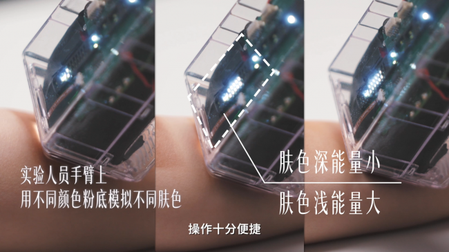 AI智能测肤:配备了AI智能肤色识别技术——当出光口贴合皮肤时,机器内的算法会自动识别肤色并匹配合适的能量参数。在实验室现场,工作人员在手臂上涂抹深棕色、中小麦色、自然色粉底模拟不同肤色,肌肤颜色浅,自动调大能量,保证脱毛效果;肌肤颜色深自动调小能量,保证体感舒适。