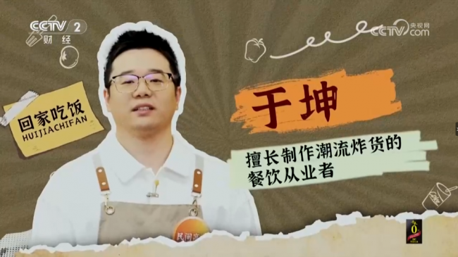2026年4月8日,CCTV - 2财经频道《回家吃饭》栏目迎来一位特殊嘉宾——鸡柳大人品牌创始人于坤。作为民间厨艺高手,他与主持人王小丫及专业大厨展开了一场别开生面的美食对决,现场揭秘鸡柳、年糕、薯条等潮流小吃的独家制作方法,让观众在家也能轻松复刻排队难买的爆款美味。