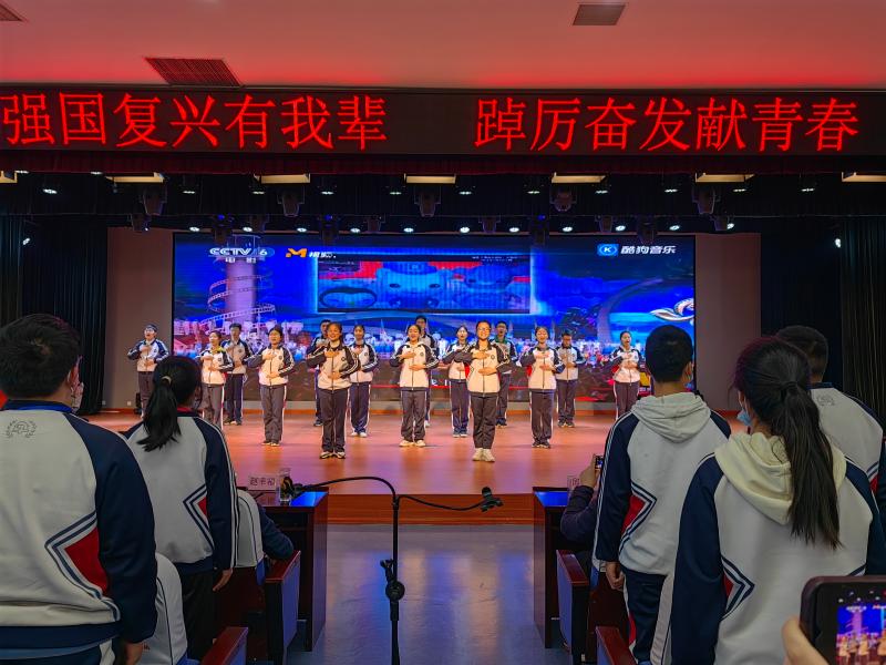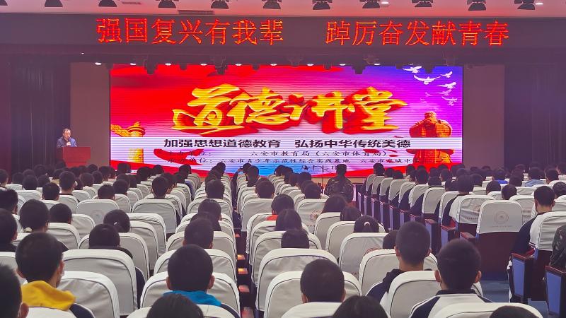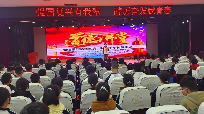 春回大地,万物复苏,实践基地报告厅内歌声荡漾、激情飞扬,上演了以“强国复兴有我辈 踔厉奋发献青春”为主题的道德讲堂活动。此次道德讲堂活动由六安市教育局主办,六安市青少年示范性综合实践基地和六安市皋城中学承办。共有唱歌曲、讲故事、诵经典、学道德模范、发心灵感悟、送平安吉祥、领导发言七个环节。