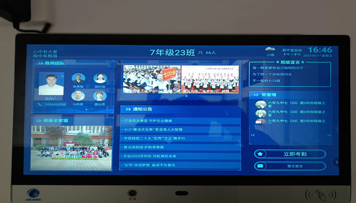 智慧班牌不仅是展示特色班级文化的窗口,也是各班级进行教学管理和德育教育的好帮手。智慧班牌中的“考勤打卡”功能,便捷高效,学生通过班牌刷脸考勤,系统实时记录;家长可以通过app远程查看孩子到校签到、身体健康等信息;班主任查看考勤记录,可以更高效地了解学生出勤状况,进行班级管理。家长还可以通过微信公众号“天云智慧校园”直接给孩子发送留言,学生通过刷卡解锁自己的留言板,接收、查看家长留言。“家长留言”功能,确保家长与孩子能够及时、便捷地沟通,做到了家校互通无障碍,助力学校落实“五项管理”,加强手机管理的工作,推动育人质量全面提升。智慧班牌的入驻使用,将助力六安九中智慧校园建设,提高学校教育信息化水平,推进教育信息化与校园管理的深度融合。
