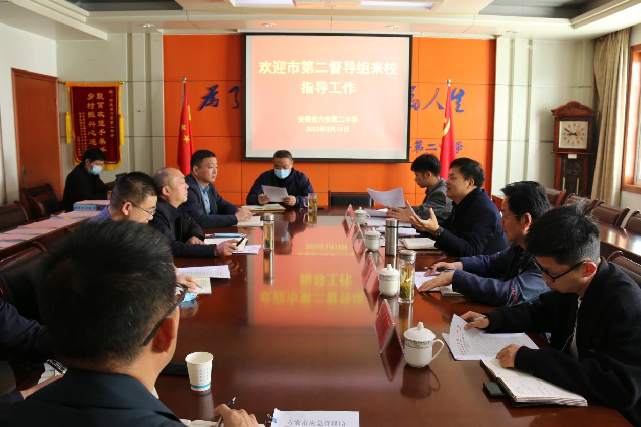 3月14日下午,市学校安全工作第二督导组组长、市应急局党委委员、副局长叶少勇一行来六安二中指导工作并召开座谈会。党委书记、校长关世宏,党委委员、副校长罗会武、刘显洋及相关处室负责同志参加会议。