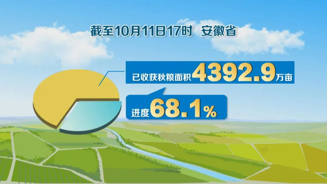截至10月11日17时,全省已收获秋粮面积4392.9万亩、进度68.1%,其中,一季稻1796.2万亩、进度55.7%,玉米1644.1万亩、进度90.6%,大豆851.3万亩、进度89.9%。
