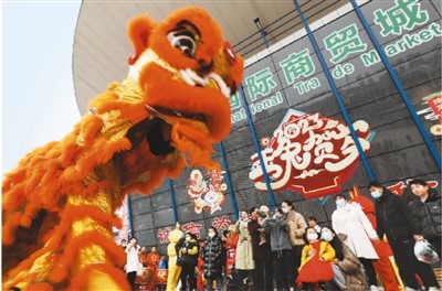 2月2日,全球最大的小商品集散中心——浙江义乌国际商贸城开市,7.5万商户喜迎境内外宾朋,四海客商到场抢商机、做贸易、谈合作。图为市民舞龙舞狮欢庆义乌国际商贸城开市。