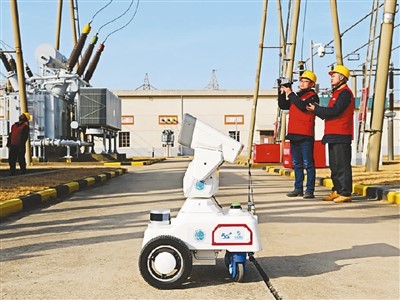 在安徽省滁州市定远县220千伏变电站,一台5G智能机器人和运维人员对变电站内主要供电设备进行巡检。