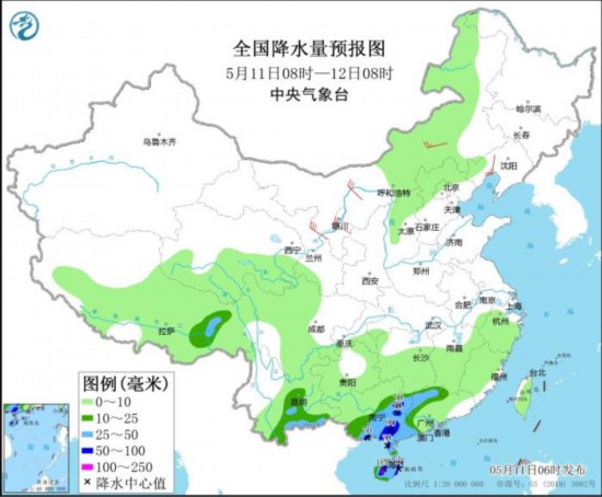 5月11日08时至12日08时,西藏北部、青海南部、四川西北部等地的部分地区有小到中雪或雨夹雪,局地有大雪;西藏东南部、云南中南部、广西东部和中南部、广东北部和西部、海南岛等地部分地区有中到大雨,其中,广西东部和南部沿海、广东西南部、海南岛西部和东部沿海等地局地有暴雨或大暴雨(100~120毫米)。内蒙古大部、宁夏北部、甘肃中部、山西北部、辽宁中西部等地部分地区有4~6级风。