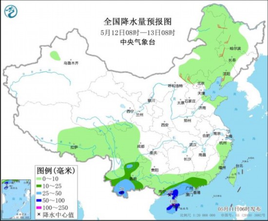 5月12日08时至13日08时,四川南部、云南中南部、广西东南部、广东大部和海南岛等地部分地区有中到大雨,其中,云南西南部、广西东南部、广东西南部、海南岛东部和北部等地部分地区有暴雨或大暴雨(100~120毫米)。内蒙古大部、黑龙江西南部、吉林西部、辽宁、河北西北部等地部分地区有4~6级风。