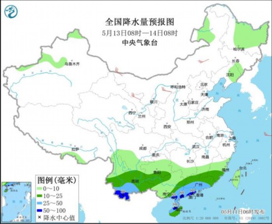 5月13日08时至14日08时,云南中南部、贵州南部、广西西北部和东南部、广东、海南岛、福建南部等地部分地区有中到大雨,其中,云南西南部、广西东南部沿海、广东西南部、海南岛北部等地局地有暴雨(50~80毫米)。内蒙古河套地区和中部、陕西北部、河北北部等地部分地区有4~5级风。