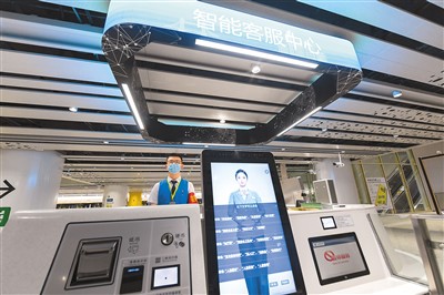 在深圳地铁黄木岗枢纽,工作人员在智能客服中心工作。
