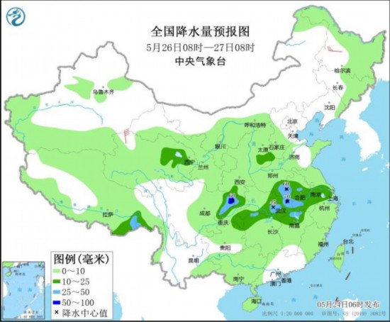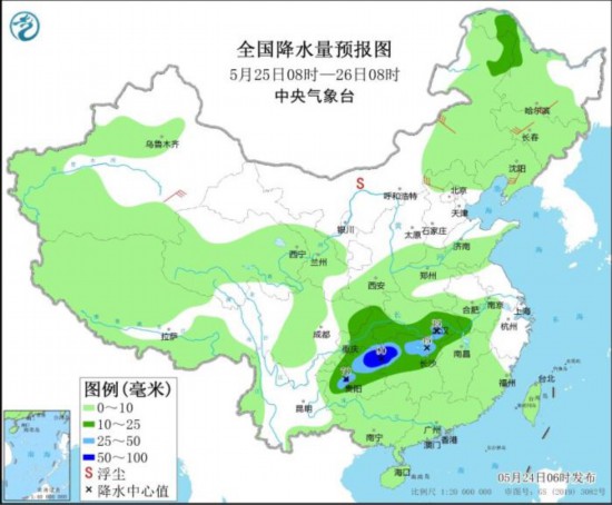 5月25日08时至26日08时,内蒙古东北部、黑龙江西北部、江汉、江南北部、西南地区东部等地部分地区有中到大雨,其中,湖南西北部、重庆东南部、贵州中部和东北部等地部分地区有暴雨(50~90毫米)。内蒙古中东部、黑龙江东南部、吉林中部、辽宁东部、新疆南疆盆地、河北北部等地部分地区有5~6级风。此外,内蒙古西部的部分地区有扬沙或浮尘天气。
