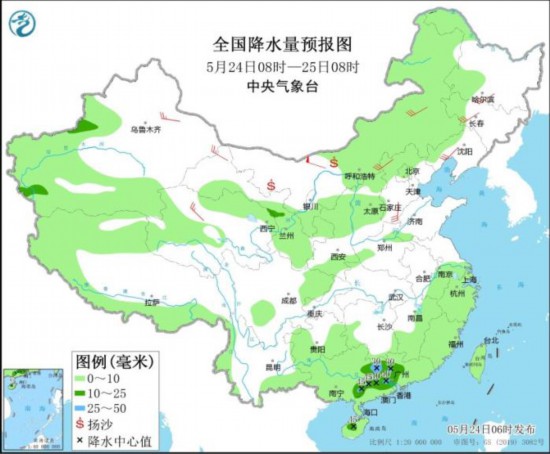 5月24日08时至25日08时,广东中西部、广西东部、海南岛西北部等地部分地区有中雨,局地大雨(25~45毫米)。内蒙古、黑龙江南部、吉林中西部、辽宁、新疆沿天山地区、青海北部、甘肃河西、河北等地部分地区有4~6级风,其中,内蒙古西北部部分地区有7~8级风。此外,内蒙古中西部的部分地区有扬沙或浮尘天气。