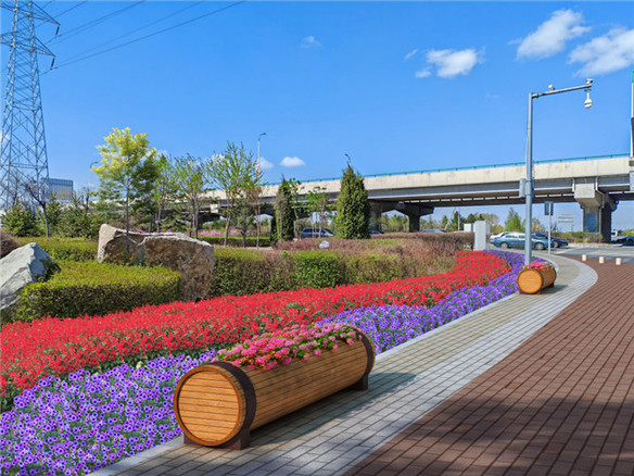 北一路与大广高速交叉口节点有两处,分别为东南角和东北角,计划放置12个花箱,栽植花卉约9000株。