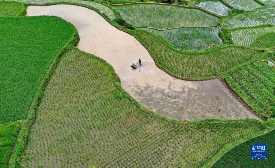 6月20日,贵州省黔东南苗族侗族自治州丹寨县金泉街道排正村村民在梯田间犁田(无人机照片)。