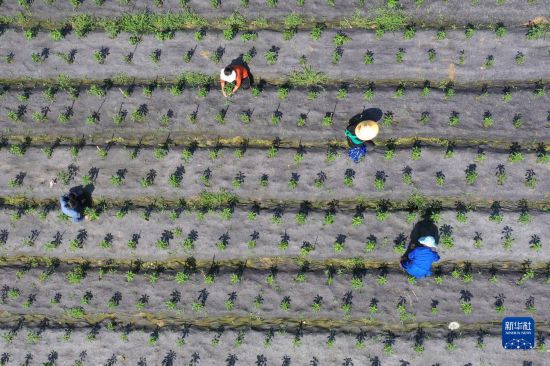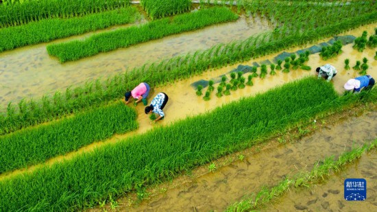 6月20日,在湖南省湘西土家族苗族自治州龙山县石羔街道泗坪村,农民在田间忙碌(无人机照片)。