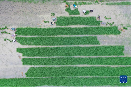 6月20日,村民在贵州省黔东南苗族侗族自治州岑巩县注溪镇注溪村辣椒种植基地劳作(无人机照片)。
