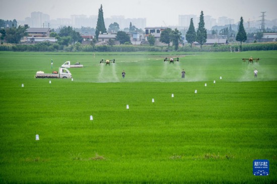 6月20日,在四川省眉山市彭山区公义镇欣荣村水稻种子生产基地,农机员开展植保无人机病虫害综合防治作业(无人机照片)。
