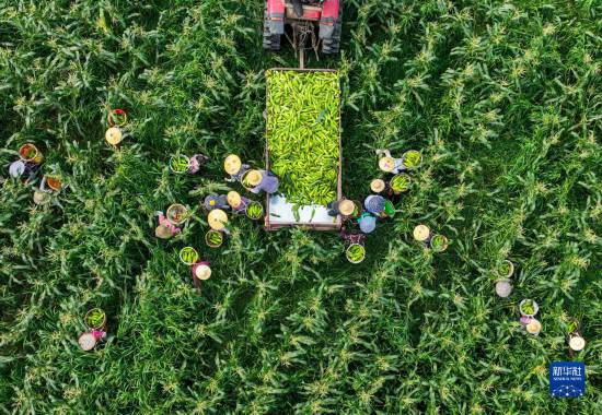 6月20日,在四川省南充市蓬安县锦屏镇中坝社区,农民在地里收获玉米(无人机照片)。