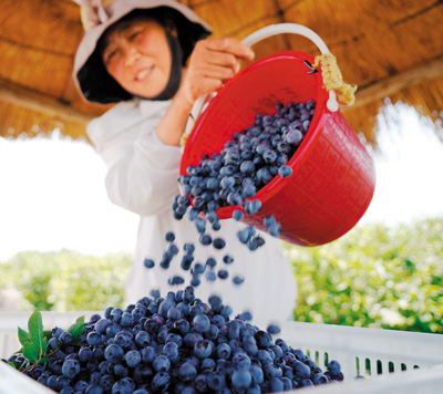 每年6-7月是国内蓝莓成熟高峰期。图为6月9日,村民在山东省临沂市沂南县苏村镇蓝莓园装运蓝莓。