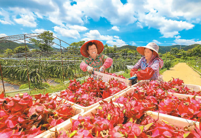 6月20日,在江西省赣州市大余县新城镇桥西村红心火龙果种植基地,果农们忙着采收,供应市场。