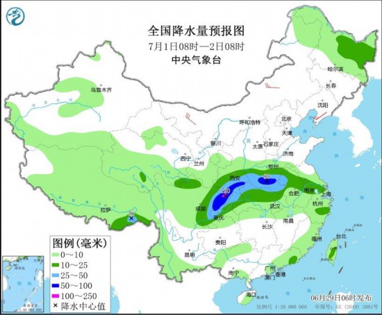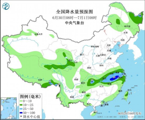 图4 全国降水量预报图(6月29日08时-30日08时) 图自中央气象台网站