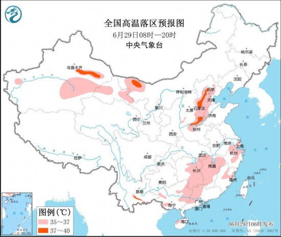 图3 全国高温落区预报图(6月29日08时-20时) 图自中央气象台网站