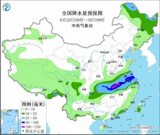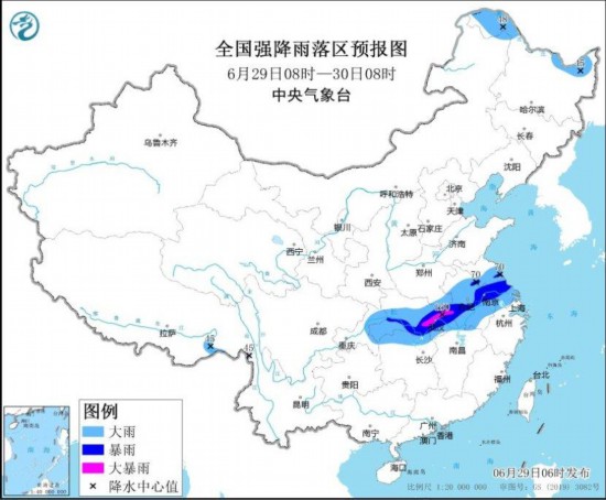 图1 全国强降雨落区预报图(6月29日08时-30日08时) 图自中央气象台网站