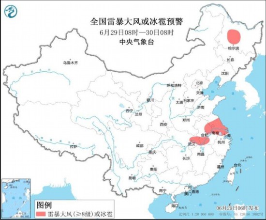 中央气象台6月29日06时继续发布暴雨蓝色预警和强对流天气黄色预警:预计,6月29日08时至30日08时,黄淮南部、江淮、江汉中南部、江南北部、重庆东部以及黑龙江北部、内蒙古东北部等地部分地区有大到暴雨,其中,湖北东部等地局地有大暴雨(100~150毫米)。上述部分地区伴有短时强降水(最大小时降雨量30~50毫米,局地可超过70毫米),黑龙江中部、安徽中南部、江苏中南部、上海西北部、湖北东部等地的部分地区将有8~10级雷暴大风或冰雹天气,局地风力11级,江苏中南部局地可能伴有龙卷(见图1和图2)。强对流的主要影响时段为今天午后至夜间。