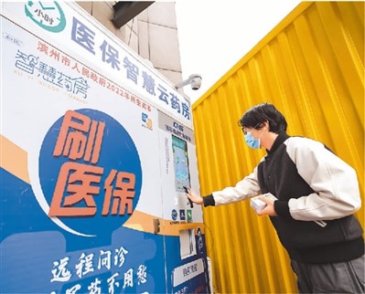 在山东省滨州市的一处24小时医保智慧云药房,市民自助扫码购药。