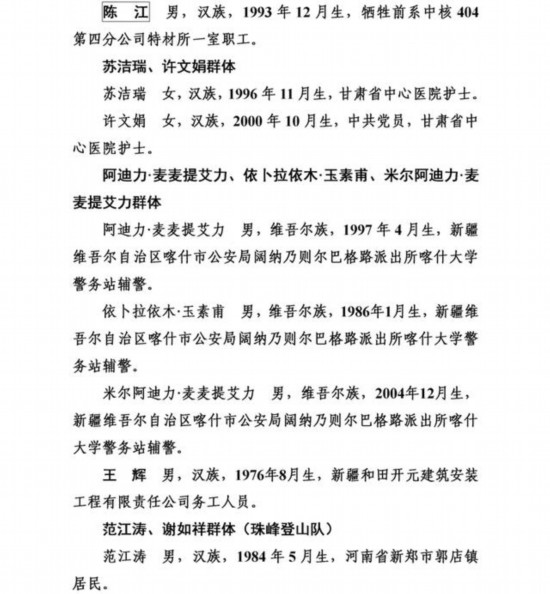 上榜勇士中,有从高桥上跳水救人导致胸椎骨折的外卖小哥彭清林和另一位高桥跳水救人的中学教师丁成闯;有冒着9级大风在海上营救遇险台胞的渔民蔡芳轮、蔡胜利;有放弃登顶珠峰机会而救助同胞的珠峰登山队队员范江涛、谢如祥;有万米高空机舱里抢救濒危病人的护士长刘素琴;有勇斗盗贼被刺几刀仍不退缩的江苏村民李培武;有身患癌症却横渡渌江河救人的乐观大姐钟慧慈;有跳进充满沼气深井救人致多器官感染的山东小伙李字旭;更有冒死救援落水群众壮烈牺牲的潘灿灿、朱先鸽、尹新朋、乔军、徐毅晖、杨华清、陈江七位勇士,让我们致以最崇高的敬意!