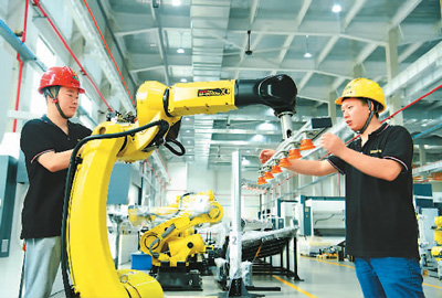 7月3日,在江苏省太仓市城厢镇瑞铁机床(苏州)股份有限公司,生产技术人员正在装配销往市场的工业机器人。