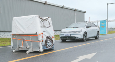 车辆在浙江省湖州市德清智能网联汽车测试场参加紧急制动测试。