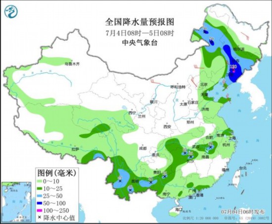7月4日08时至5日08时,7月4日08时至5日08时,内蒙古东北部、黑龙江西南部、吉林、辽宁中东部、云南西部和南部等地部分地区有大到暴雨,其中,辽宁东北部等地局地有大暴雨(100~120毫米)。内蒙古、黑龙江、辽宁、河北北部、山东半岛等地部分地区有4~6级风。
