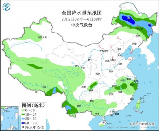 全国降水量预报图(7月5日08时-6日08时)。图片来源:中央气象台网站