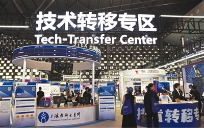 在第九届中国(上海)国际技术进出口交易会上,与会者在技术转移专区参观。