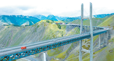 新疆伊犁,一辆京东物流车途经果子沟大桥。