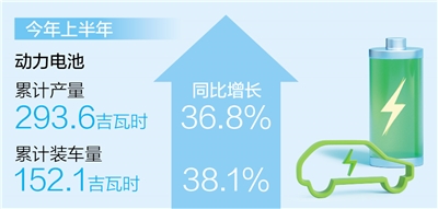 本报北京7月16日电 (记者王政)记者从中国汽车动力电池产业创新联盟获悉:今年上半年,我国动力电池累计产量达293.6吉瓦时,同比增长36.8%;累计装车量152.1吉瓦时,同比增长38.1%;累计出口达56.7吉瓦时。