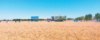 在内蒙古自治区巴彦淖尔市磴口县包尔盖农场一分场,由先正达集团中国MAP磴口技术服务中心提供托管服务的麦田开镰收割。
