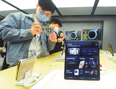顾客在华为浙江杭州旗舰店体验新发布的折叠屏手机旗舰华为Mate X3。