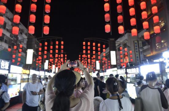 图为7月11日晚,游客在河南洛阳十字街小吃一条街拍摄夜景 记者鲁鹏 摄