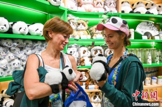8月1日,成都大运会期间,成都大熊猫繁育研究基地成为参赛代表团的热门打卡点,图为匈牙利选手凡妮(右)选购大熊猫玩偶。中新社记者 赵文宇 摄