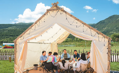 近年来,位于六盘山腹地的宁夏回族自治区固原市泾源县大湾乡杨岭村探索农旅融合发展模式,种植芍药、金丝菊等中药材近500亩,打造集采摘赏花、休闲度假、民俗体验于一体的新业态。图为游客在杨岭村品尝当地美食。